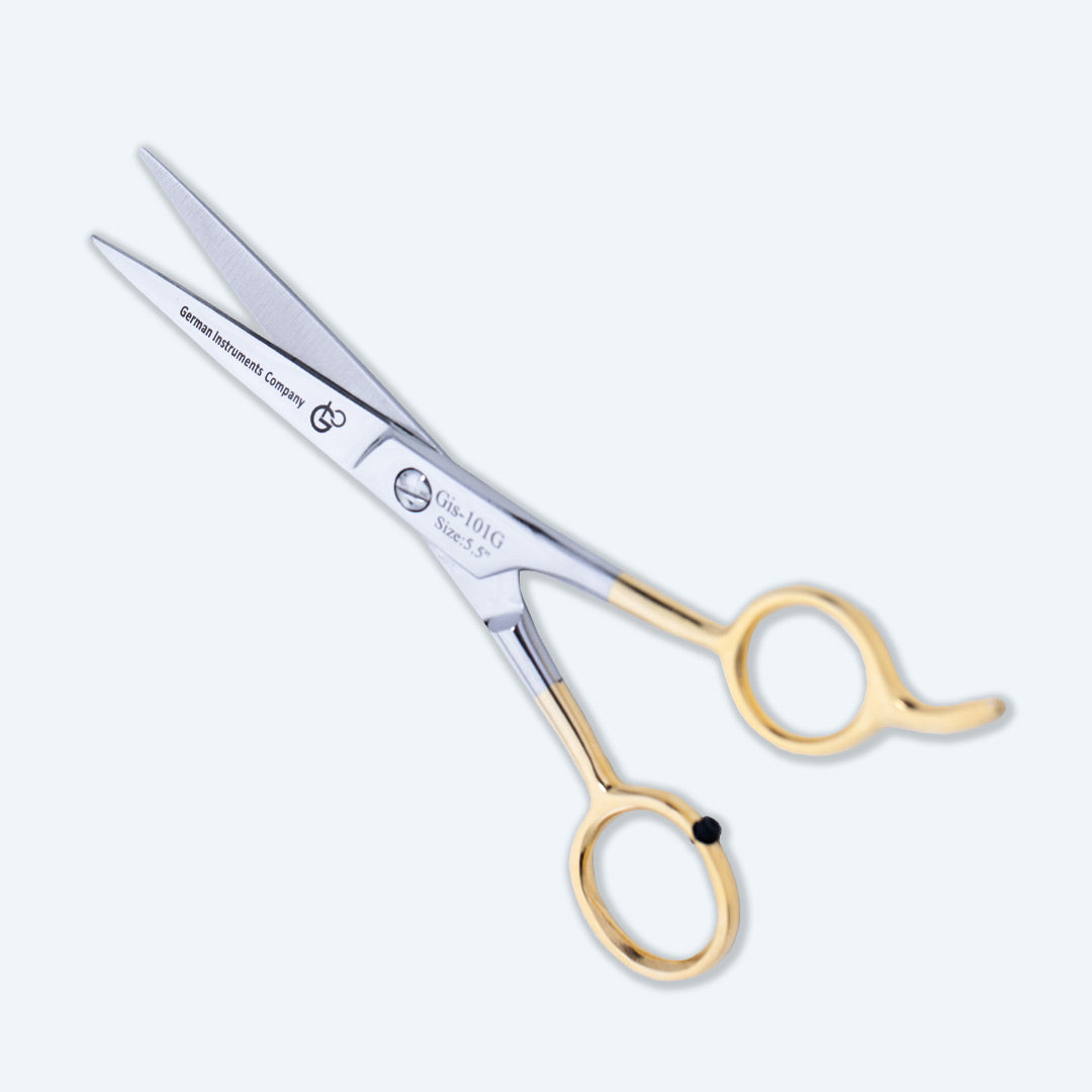 The 5.5-inch half gold German shiny stainless steel haircut scissors with a fine adjustment screw and sharp convex edge blade sound like a high-quality tool designed for professional hairdressers and barbers. Here's a detailed description of these scissors: