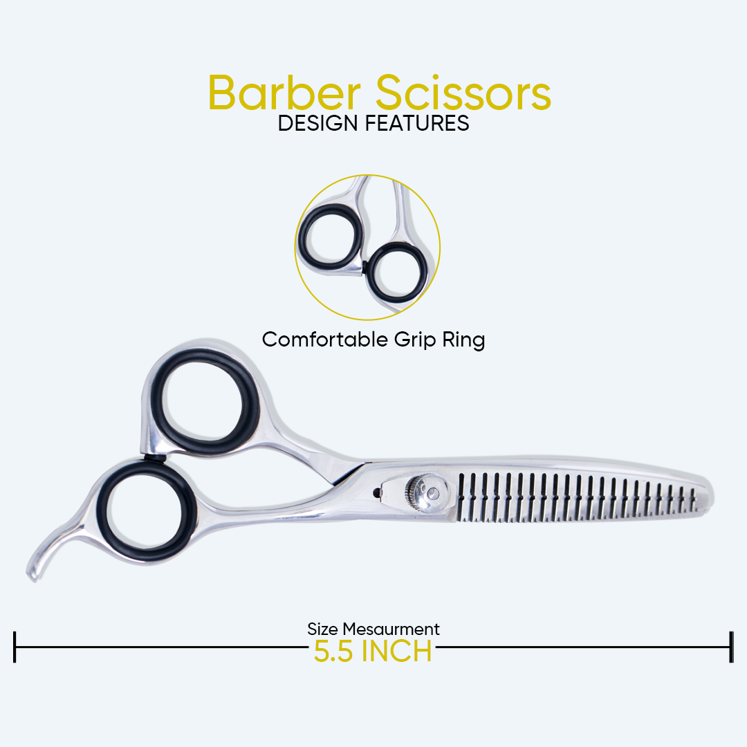 The 5.5-inch sharp blade barber thinning shears with an adjustable nut, rubber silencer, and comfortable grip ring are designed to offer precision and ease in hair thinning and texturizing. These shears are particularly suitable for professionals who prioritize control and comfort in their cutting tools. Here’s an overview of their features and benefits: